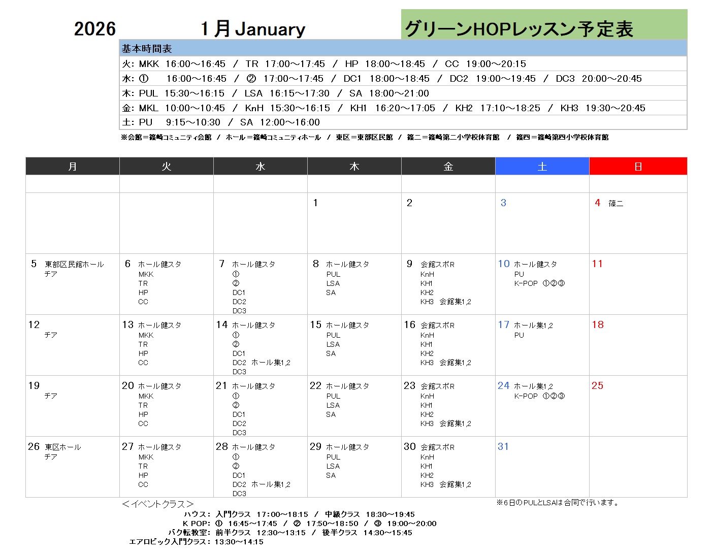 2026年1月レッスン予定表【2026/1/3更新】