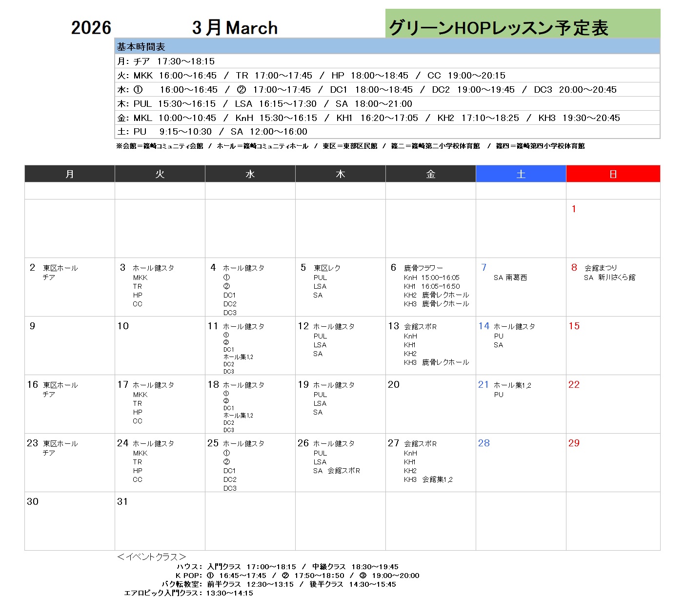 2026年3月レッスン予定表【2026/3/1更新】